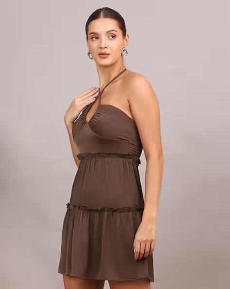 Elevate your evening look with this striking halter neck mini dress, designed for those who command attention. The criss-cross halter detail creates a flattering neckline while the fit-and-flare silhouette accentuates your curves with effortless grace. Perfect for cocktail parties, celebrations, and upscale gatherings, this dress combines contemporary styling with timeless elegance. The structured bodice ensures confident support, while the flared skirt offers freedom of movement. An ideal choice for making a sophisticated statement at any festive occasion.